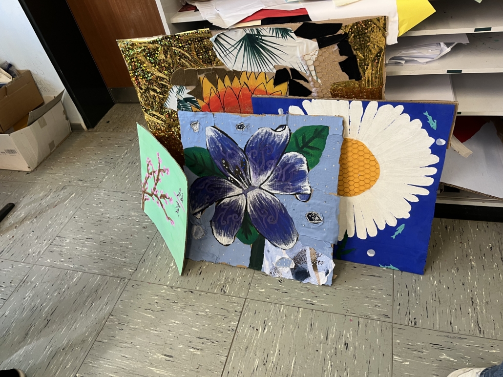 In ihrem Projekt hat sie eine Blume auf Pappe gemalt. Auch wenn das zunächst einfach klingt, ist es besonders, weil die Pappe vorher nur als Abfall galt.