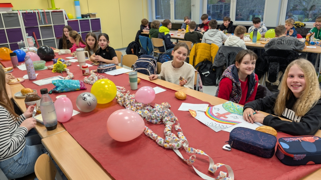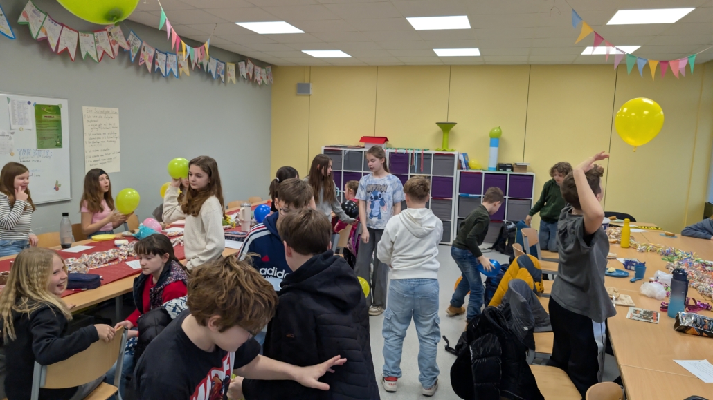 Anschließend wurde gemeinsam gefrühstückt, gesungen und gespielt. Bei der „Nicht-Lachen-Challenge“ und dem „ABC-Spiel“ hatten alle viel Spaß. Der Klassenraum war festlich geschmückt: Luftschlangen, Luftballons, Blumen und bunte Poster sorgten für eine ausgelassene Atmosphäre. Die Stimmung war fröhlich und wertschätzend.