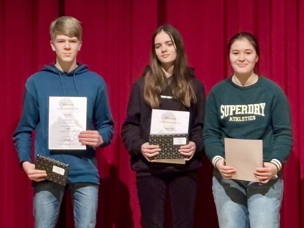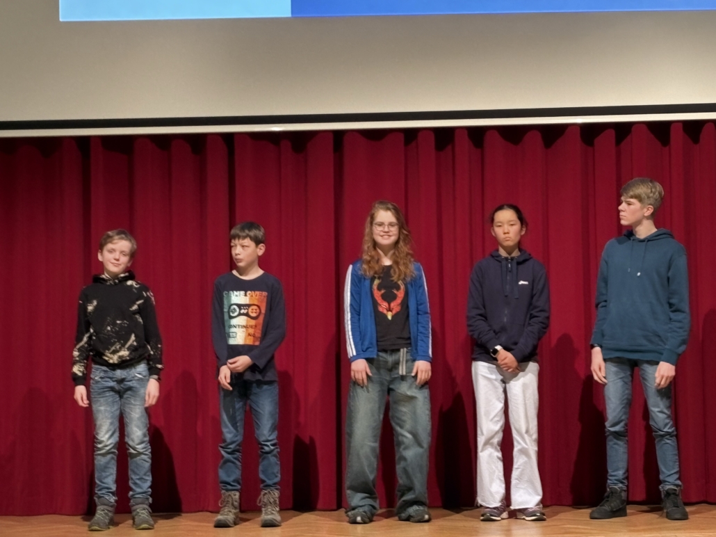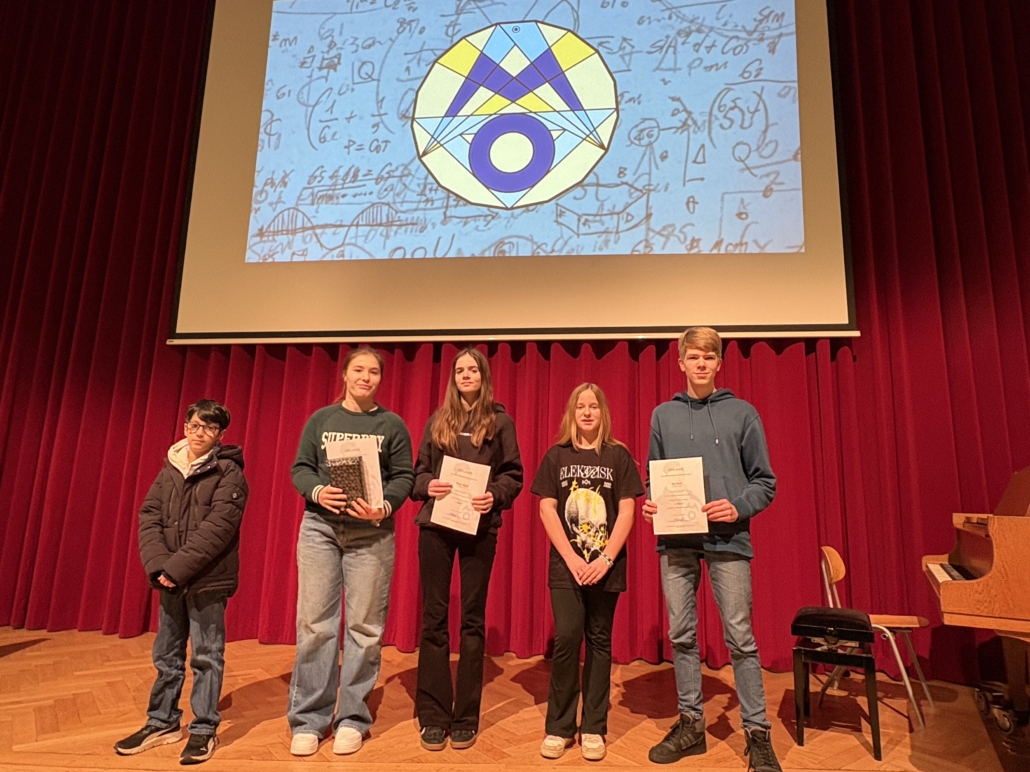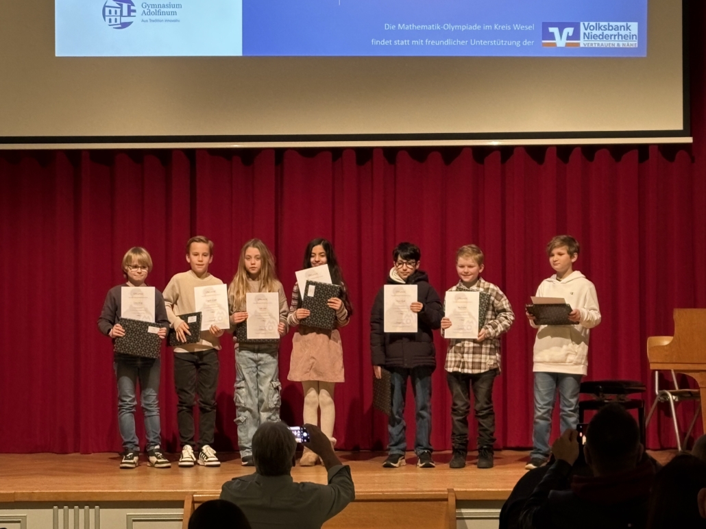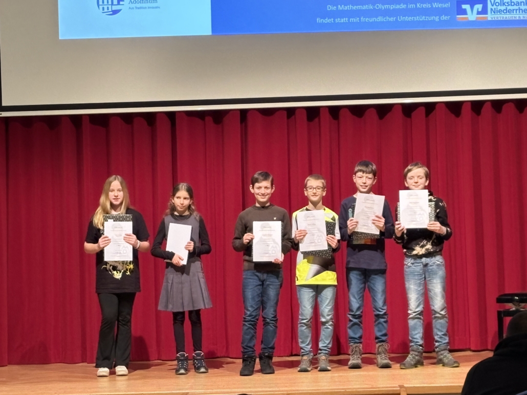 Teram, Lucy, Anesa, Ronja, Zorba und Jan wurden für ihre herausragenden Leistungen in der Kreisrunde geehrt. In feierlichem Rahmen nahmen sie im Februar in der Aula des Gymnasiums Adolfinum in Moers – gemeinsam mit weiteren Preisträgerinnen und Preisträgern des Kreises Wesel – ihre Auszeichnungen in Form von Urkunden und Buchpräsenten entgegen. Besonders bemerkenswert an diesem Abend war, dass ab der Jahrgangsstufe 10 ausschließlich Schülerinnen und Schüler des GV auf der Bühne standen. Besonders stolz sind wir auf Jan Kurz, der sich sogar einen der wenigen Startplätze für die Landesrunde sicherte. Für die Qualifikation zur Bundesrunde war die Konkurrenz in Münster jedoch zu stark.
